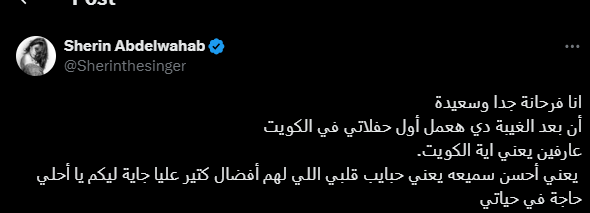 وقالت في منشورها: أنا فرحانة جدا وسعيدة أن بعد الغيبة دي هعمل أول حفلاتي في الكويت، عارفين يعني ايه الكويت. يعني أحسن سميعة، يعني حبايب قلبي اللي لهم أفضال كتير عليا، جاية ليكم يا أحلى حاجة في حياتي.