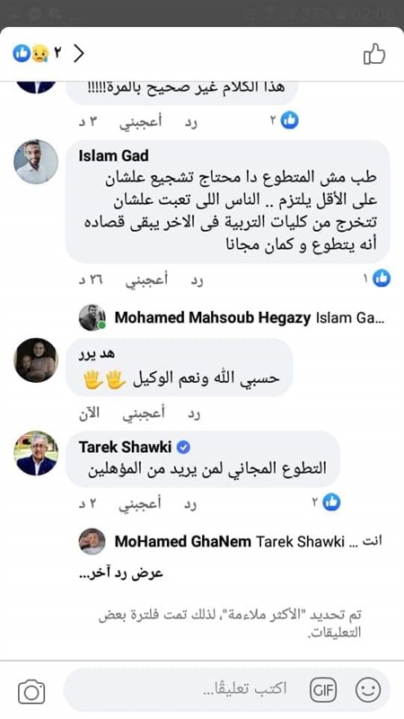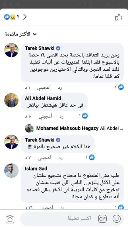 أوضح الدكتور طارق شوقي وزير التربية والتعليم والتعليم الفنى، أن التطوع للعمل بالتدريس بكون مجانا لحملة المؤهلات التربويه العليا ويتم بالتقدم بطلب لمدير الإدارة، ثم إحالته لموجه أول المادة لتكليفه بالعمل طبقا للشروط الوارده بالكتاب الدوري.