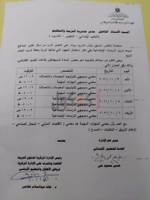 أرسلت وزارة التربية والتعليم والتعليم الفني، خطابا لجميع مديريات التربية والتعليم بالمحافظات، بشأن تدريب معلمي الصف الرابع الابتدائي، وجاء نص الخطاب كالتالي: