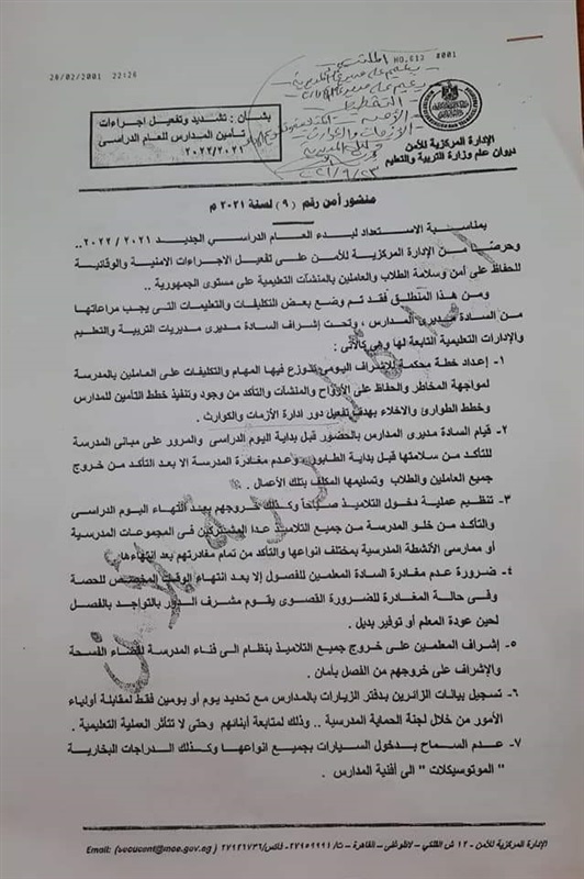 1- تفعيـل الإجراءات الأمنية والوقائية للحفاظ على أمن وسلامة الطلاب والعاملين بالمنشآت التعليمية على مستوى الجمهورية.