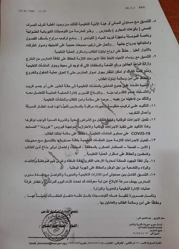 19- تفعيل الإجراءات اللازمـة حـول المنشآت التعليمية بكافة مستوياتها بالتنسيق مع جميع المديريات لضمان توفير مناخ آمن للطلاب والمعلمين والحفاظ على استقرار العملية التعليمية.