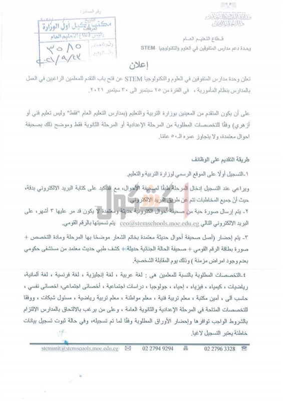 - التخصصات المطلوبة هي : عربي وانجليزي ولغة فرنسية والمانية ورياضيات وكيمياء وفيزياء وأحياء وجيولوجيا ودراسات اجتماعي واخصائي إجتماعي واخصائي نقسي وحاسب الي وأمين مكتبة ومعلم تربية فنية ومعلم مواطنة معلم تربية رياضية مسئول شبكات