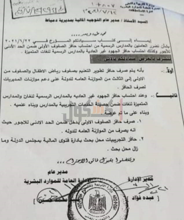 ونص الخطاب، علي أنه إيماءً إلى الكتاب الدوري الصادر بتاريخ 22 يونيو الماضي 2021، بشأن تضرر العاملين بالمدارس الرسمية من احتساب حافز الصفوف الأولى ضمن الحد الأدنى للأجور وكذلك احتساب حافز الجهود غير العادية بالمدارس الرسمية للغات المتميزة يعرض الآتي: