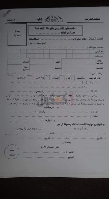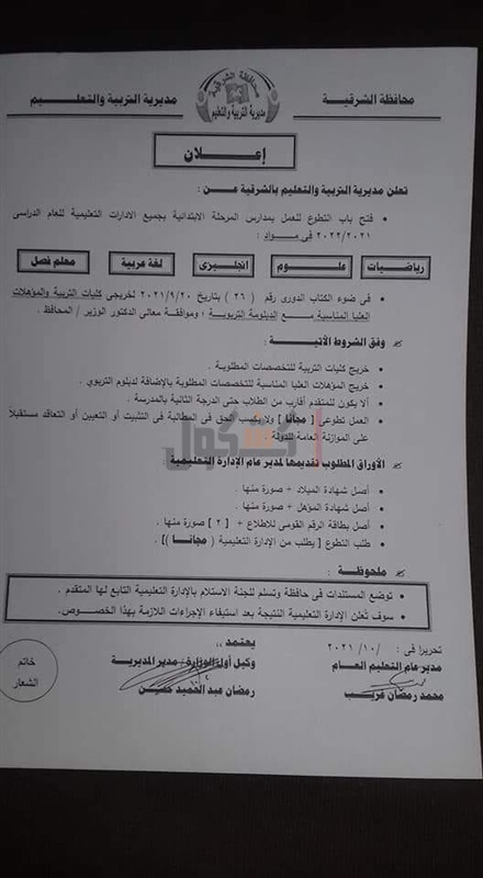 أعلنت مديرية التربية والتعليم بالشرقية عن فتح باب التطوع للعمل بمدارس المرحلة الابتدائية بجميع الادارات التعليمية خلال العام الدارسي 2021 / 2022، في المواد التالية رياضيات علوم انجليزي لغة عربية معلم فصل.