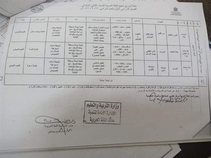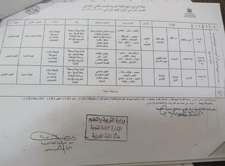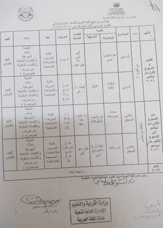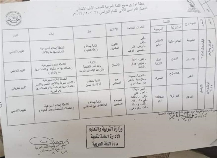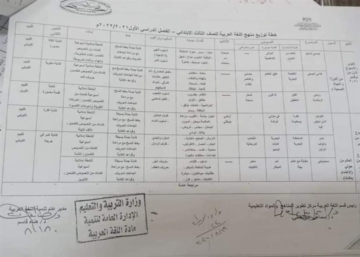 ننشر خطة توزيع منهج اللغة العربية للصفوف الأولى للمرحلة الابتدائية