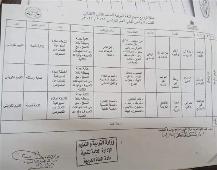 وننشر فى فى التقرير التالي خطة توزيع منهج اللغة العربية للصفوف الأولى: