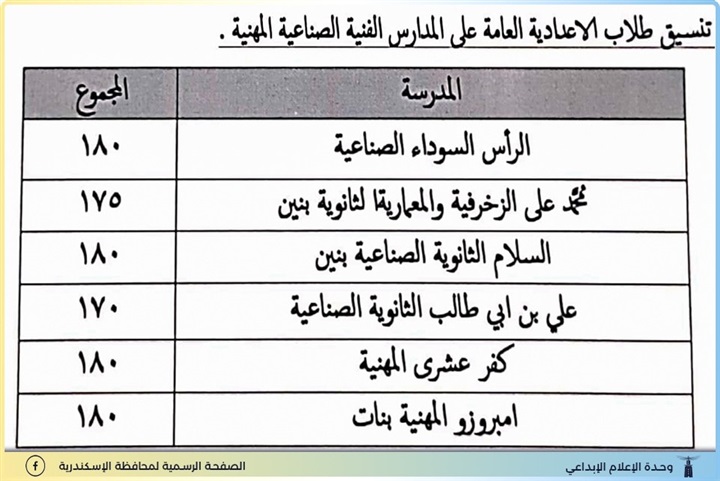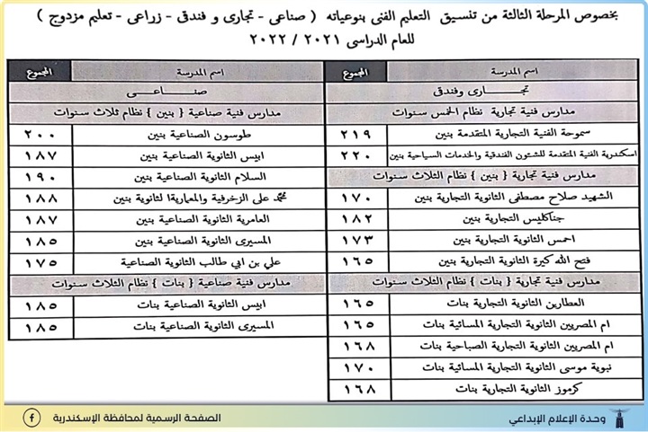 اعتمد اللواء محمد الشريف محافظ الإسكندرية، تنسيق المرحلة الثالثة وتنسيق طلاب الخدمات للتعليم الفني بنوعياته للعام الدراسي 2021 / 2022 بنظام الثلاث سنوات والخمس سنوات بناءً على أعداد المدارس الفنية والفصول والورش والمعامل المتاحة بالتعليم الفني الصناعي والزراعي والتجاري والفندقي، وفرص التدريب بالتعليم المزدوج.