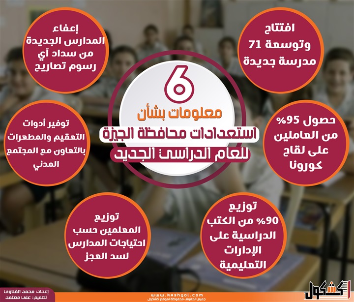 جراف بالانفوجراف.. 6 معلومات بشأن استعدادات محافظة الجيزة للعام الدراسي الجديد محمد القناوي الأربعاء 06/أكتوبر/2021 - 12:43 م 10/6/2021 12:43:00 PM طباعة ننشر 6 معلومات بشأن استعدادات محافظة الجيزة للعام الدراسي الجديد 2021. facebook twitter whats شارك محافظة الجيزة انفوجراف المعلومات