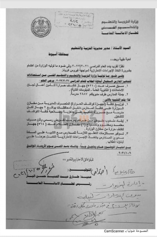 ونص الخطاب، على أنه نظرا لقرب بدء العام الدراسي ۲/۲۰۲۱ ۲۰۲ وفي ضوء ما توليه الوزارة من اهتمام بضرورة اتخاذ الإجراءات الاحترازية لمواجهة فيروس کورونا.