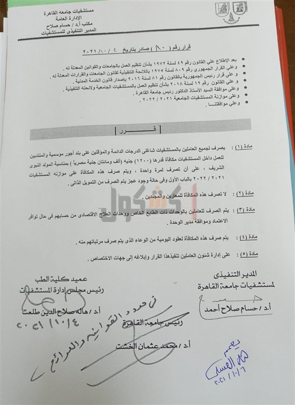 قرر الدكتور محمد عثمان الخشت القائم بأعمال رئيس جامعة القاهرة، صرف مكافأة مالية للعاملين بالمستشفيات الجامعية بجامعة القاهرة، وذلك بعد الإطلاع على القانون رقم 49 لسنة ۱۹۷۲ بشأن تنظيم العمل بالجامعات والقوانين المعدلة له، وعلى القرار الجمهوري رقم ۸۰۹ لسنة ۱۹۷۰ باللائحة التنفيذية لقانون الجامعات والقرارات المعدلة له أو على قرار رئيس الجمهورية بالقانون رقم 81 لسنة ۲۰۱6 بإصدار قانون الخدمة المدنية، وعلي القانون رقم 19 لسنة ۲۰۱۸ بشأن تنظيم العمل بالمستشفيات الجامعية ولائحته التنفيذية وعلى موافقة الدكتور رئيس جامعة القاهرة، وعلى موازنة المستشفيات الجامعية ۲۰۲۲/۲۰۲۱.