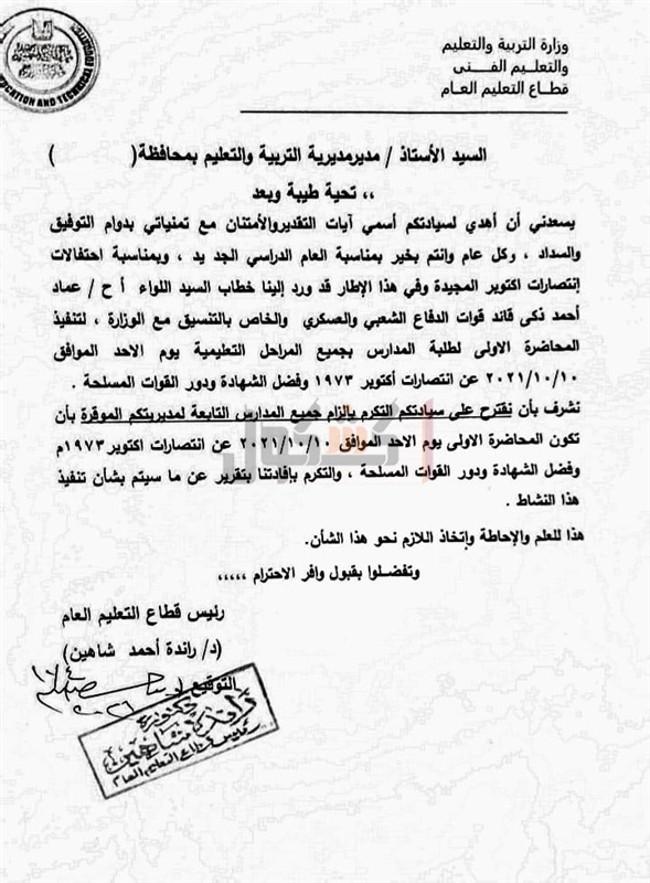 عممت وزارة التربية والتعليم والتعليم الفني، خطاب على