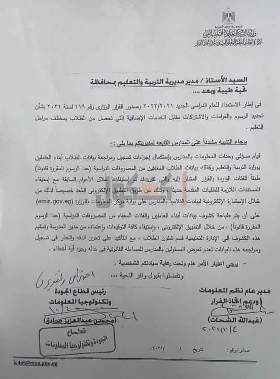 مسؤلي وحدات المعلومات بالمدارس باستكمال اجراءات تسجيل ومراجعة بيانات الطلاب