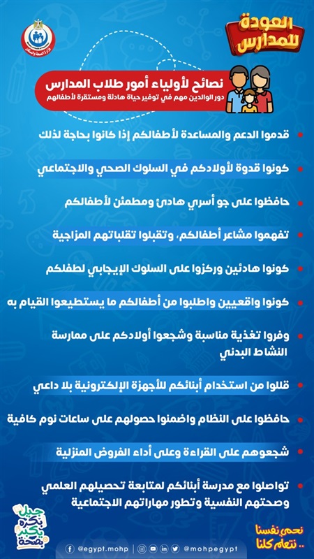 تزامنا مع اقتراب بدء العام الدراسي الجديد 2021-2022، قدمت وزارة الصحة والسكان نصائح لأولياء أمور طلاب المدارس.