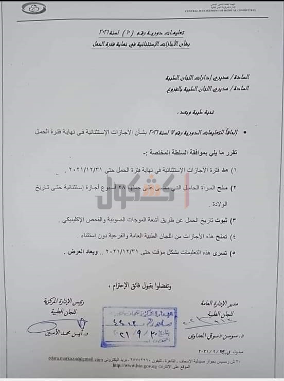 ونشرت ادارة الدقي التعليمية عبر صفحتها الرسمية علي موقع التواصل الاجتماعي فيس بوك، منشورا ينص علي التعليمات الدورية رقم ٧ لسنة ٢٠٢١ بشأن الأجازات الاستثنانية في نهابة فترة الحمل