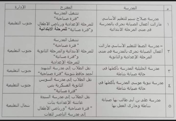 أعلنت مديرية التربية والتعليم بالسويس، الخطة البديلة للمدارس التي بها رفع كفاءة لتسكينها بمدارس اخري حرصا من مديرية التربية والتعليم علي مصلحة الطالب والعملية التعليمية.
