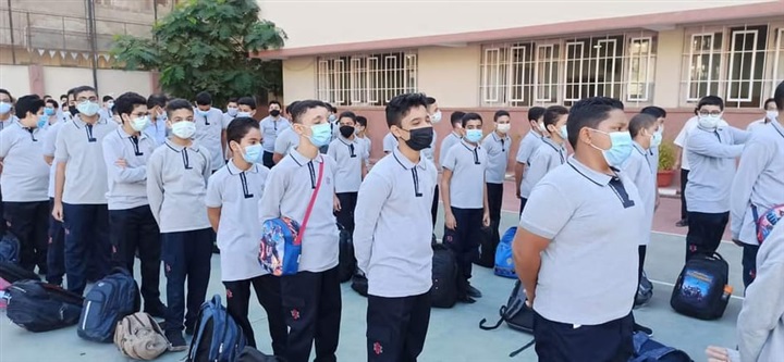 كافة الإجراءات الإحترازية والتعقيمات وقياس درجات الحرارة لجميع الطلبة، وتحقيق التباعد