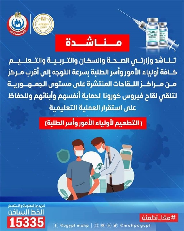 ناشدت وزارتي الصحة والسكان والتربية والتعليم كافة أولياء الأمور وأسر الطلبة من رياض الأطفال حتى مرحلة الثانوية العامة والفنية بسرعة التوجه إلى أقرب مركز من مراكز اللقاحات المنتشرة على مستوى الجمهورية لأخذ اللقاح لحماية الطلبة وللحفاظ على استقرار العملية التعليمية.