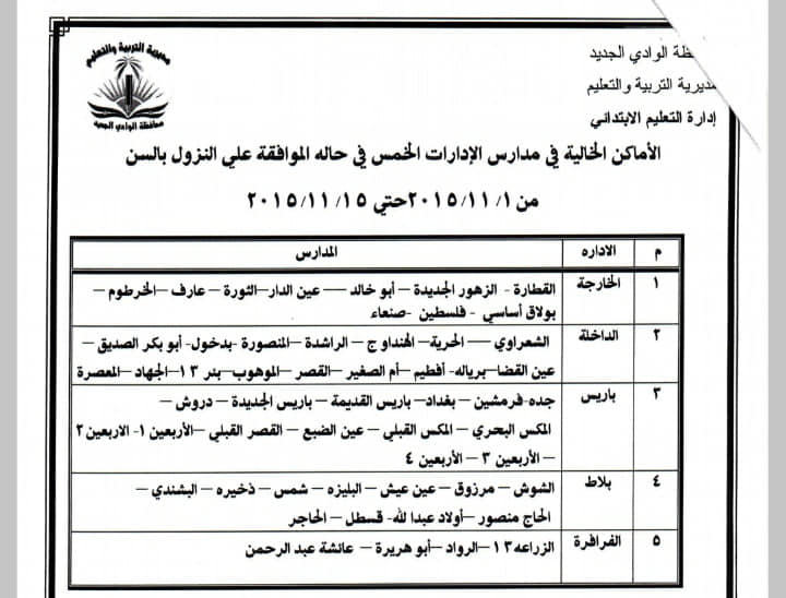 ٢٠١٥ بجميع الإدارات التعليمية حسب الأماكن الشاغرة فقط، والمرفق بيان بأسمائها، ولا