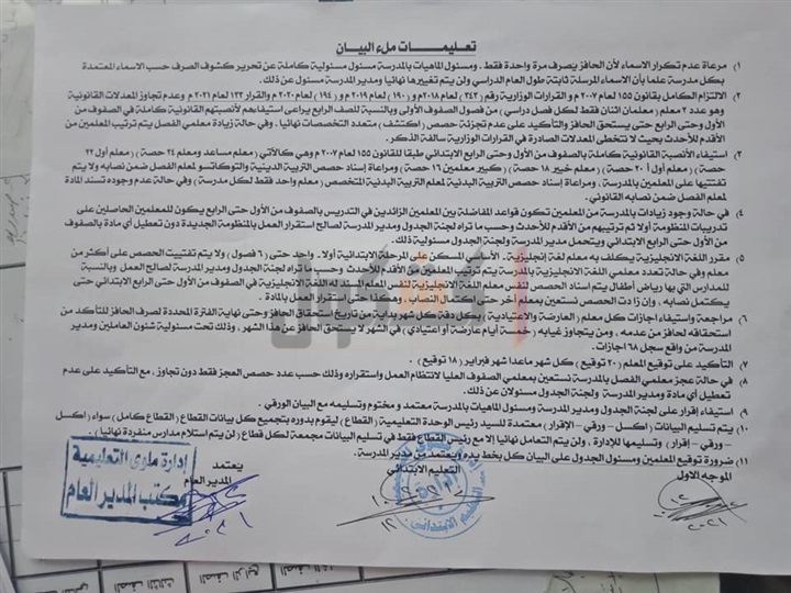 عدم استيفاء إقرار على لجنة الجدول ومدير المدرسة ومسئول