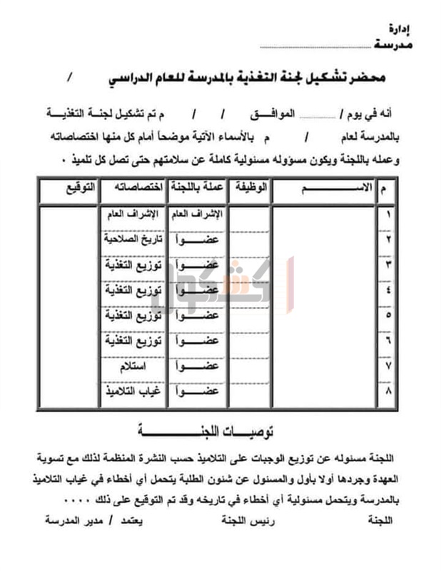 ونوهت إلي ضرورة التأكد من نظافة وسيلة نقل الوجبات من جهة التوريد للمدارس المستفيدة، على أن تقوم اللجان المختصة على كافة المستويات بالاشراف والمتابعة وتذليل العقبات وحل المشكلات واتخاذ سلامة تقديم الوجبات كلا فيما يخصه تشكيل اللجنة المحلية من "مدير مديرية التربية والتعليم_ مدير مديرية الشئون الصحية_ مدير مديرية التموين_ مدير عام التأمين الصحي_ مدير عام الخدمات_ موجه عام التغذية _ سكرتير اللجنة، أحد العاملين بالتغذية وفق قرار رئيس الوزراء في 9/8/2017.