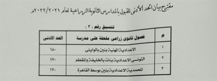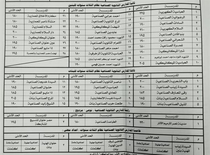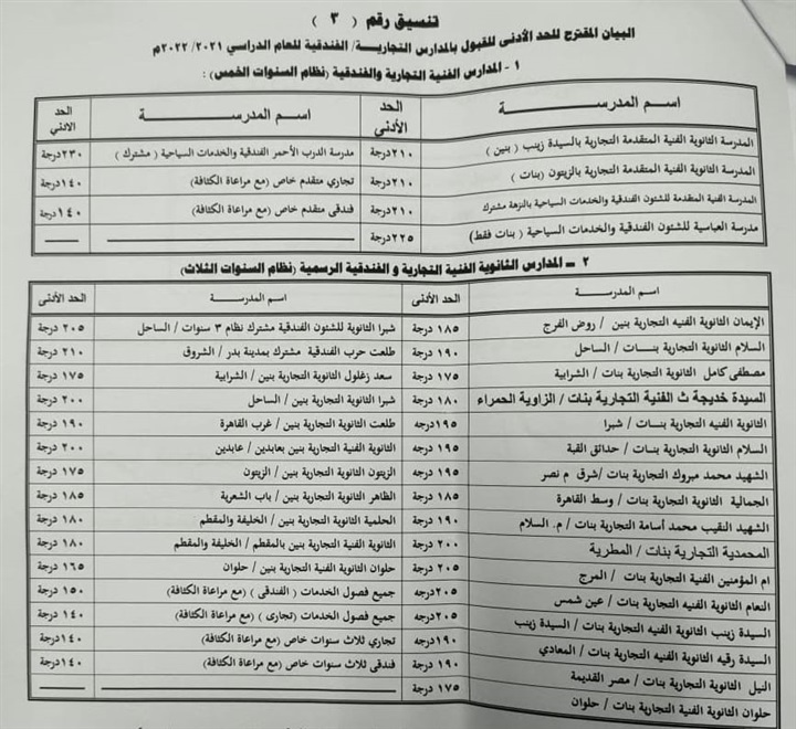 الحد الأدنى لتنسيق القبول بالمدارس الثانوية الفنية (زراعى _ تجارى _ فندقى_ صناعى)