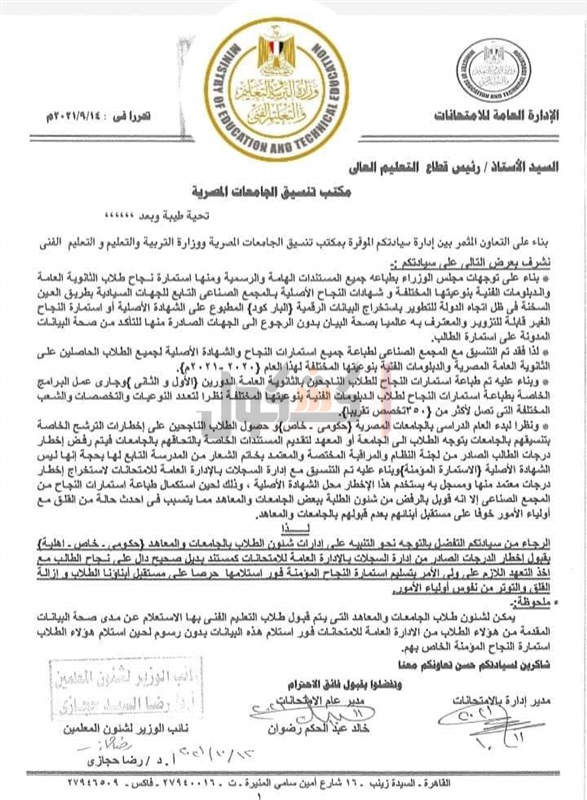 أرسلت وزارة التربية والتعليم خطاب رسمي لرئيس قطاع التعليم العالي بمكتب تنسيق الجامعات المصرية، طالبت خلاله بالتنبيه على إدارات شئون الطلاب بالجامعات والمعاهد (حكومي / خاص / أهلية) بقبول إخطار درجات طلاب الثانوية العامة الصادر من السجلات بالإدارة العامة للامتحانات كمستند بديل صحيح دال على نجاح الطالب.