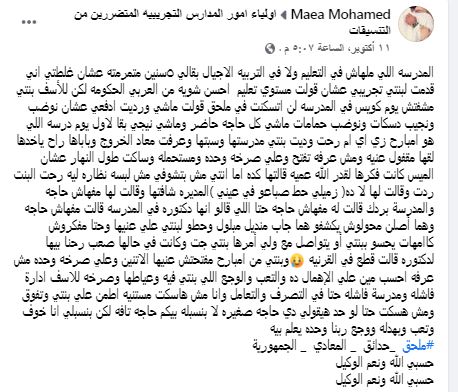 منشور على موقع التواصل الاجتماعي "فيس بوك":"غلطتي إني قدمت لبنتي