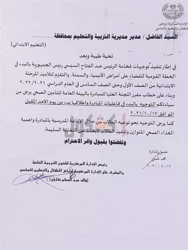 وأكدت في خطاب رسمي للمديريات التعليمية، أنه في إطار تنفيذ توجيهات الرئيس عبدالفتاح السيسي رئيس الجمهورية بالبدء في الخطة القومية للقضاء على أمراض الأنيميا والسمنة والتقزم لتلاميذ المرحلة الإبتدائية من الصف الأول حتي الصف السادس في العام الدراسي 2021/ 2022.
