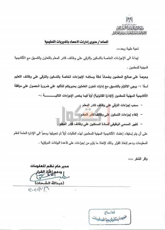 ( إيماءًا إلى الإجراءات الخاصة بالتسكين والترقي على وظائف كادر المعلم بالتنسيق مع الأكاديمية المهنية للمعلمين، يتم الإلتزام بالتنسيق مع إدارات شئون العاملين للتأكيد على ضرورة الحصول على موافقة الاكاديمية في الإجراءات التالية: