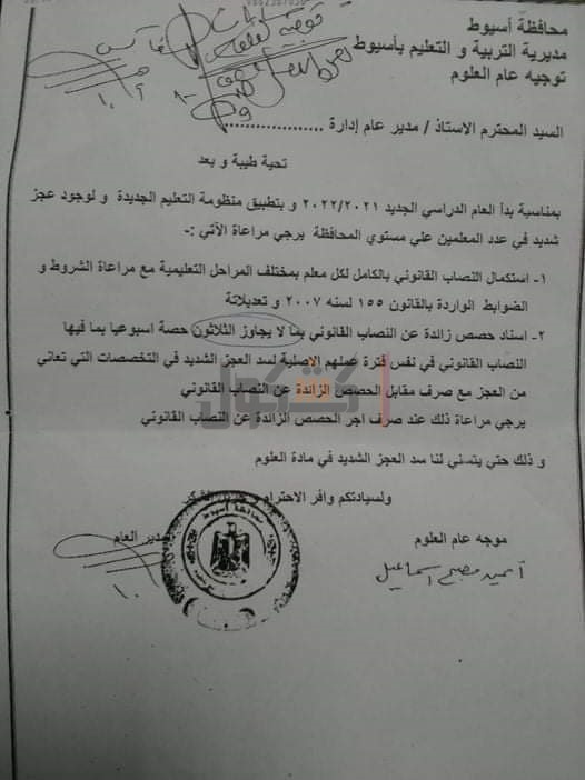 وأشارت إلي أنه بمناسبة بدء العام الدراسي الجديد 2021_ 2022 بتطبيق منظومة التعليم الجديدة ولوجود عجز شديد في عدد المعلمين على مستوي المحافظة، يتم مراعاة الآتي: