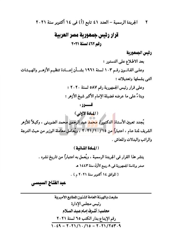 أصدر الرئيس عبد الفتاح السيسى، القرار رقم 462 لسنة 2021، بتجديد تعيين الدكتور محمد عبد الرحمن محمد الضويني، وكيلًا للأزهر الشريف لمدة عام، اعتبارًا من 15 أكتوبر الجاري.