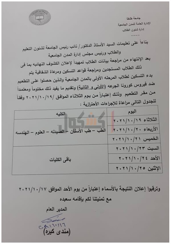 أعلن الدكتور محمود ذكي رئيس جامعة طنطا، لجميع منسوبي الجامعة من طلاب وأعضاء هيئة تدريس وعاملين أنه لن يسمح بدخول الحرم الجامعي والكليات إلا لمن تلقوا اللقاح واحضار ما يفيد ذلك، أو احضار نتيجة تحليل "PCR" لم يمض عليها أسبوع، وتطبق هذه القواعد بدءاً من أول نوفمبر المقبل.