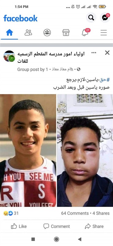 وأضافت أن المعلم وجه ياسين بالجلوس في مكانه، رغم شكوته بأن التختة ضيقة ويجلس بها مع اثنين آخرين، مضيفه أن أحد الطلاب جلس في التختة الاخيرة ولم ينهاه المعلم كما فعل مع ياسين، الذي سأله لماذا لم تأمره بأن يرجع مكانه أيضا.