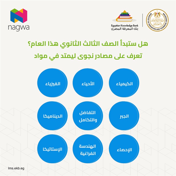 ناشدت وزارة التربية والتعليم والتعليم الفنى، طلاب الثانوية العامة، بالاعتماد على مصادر نجوى التفاعلية من خلال موقع بنك المعرفة المصرى فى المواد الدراسية المختلفة أثناء المذاكرة استعدادا لرحلة التعلم.