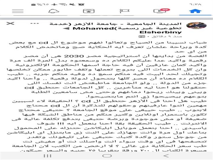 .وقال الشربيني في منشور له على صفحة المدينة الجامعية بجامعة الأزهر: "شباب نسيبنا من الصياح، وتعالوا نفهم موضوع الـ CD مع بعض كدة وبالراحة، علشان تعرف إيه الحكاية صح وما تاخدش الكلام من أي حد، القصة من بدايتها أن استراتيجية مصر 2030 هي إن مصر رقمية، وأكيد عدى عليكم الكلام ده، وسمعتوه بدل المرة ألف، وأكيد كمان عارفين ان فيه حاجة اسمها الحكومة الإلكترونية، وأن كل الخدمات اللي بتروح تعملها وتقف طابور ممكن تخلصها وتجيلك لحد البيت، فيه منكم سمع ده وفيه منكم جربه، طيب الكلام ده معناه ان مصر كلها بتتحول لدولة رقمية، واحنا أكيد جزء من الدولة، ولو الجامعة ما طبقتش انت نفسك اللي هتقولنا هو احنا ليه متأخرين، كل الجامعات هتطبق cd، وبينى وبينك ريحوا دماغهم وحتى مش سامعين الطلبة بتوعهم بيصيحوا زي انتم ما بتصيحوا".