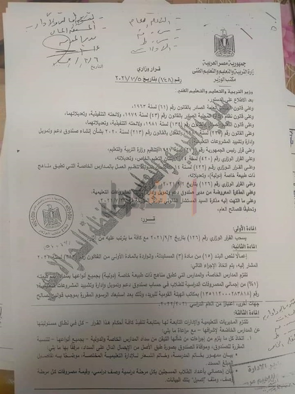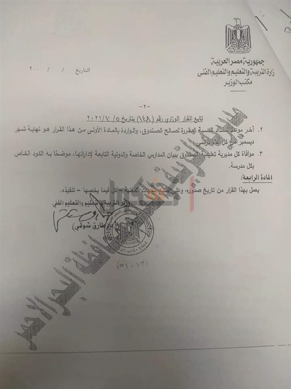 أصدرت وزارة التربية والتعليم والتعليم الفني، قرار رقم 148 لسنة 2021، شددت خلاله على ضرورة سداد قيمة 1% من ايرادات المصروفات الدراسية للمدارس الخاصة .