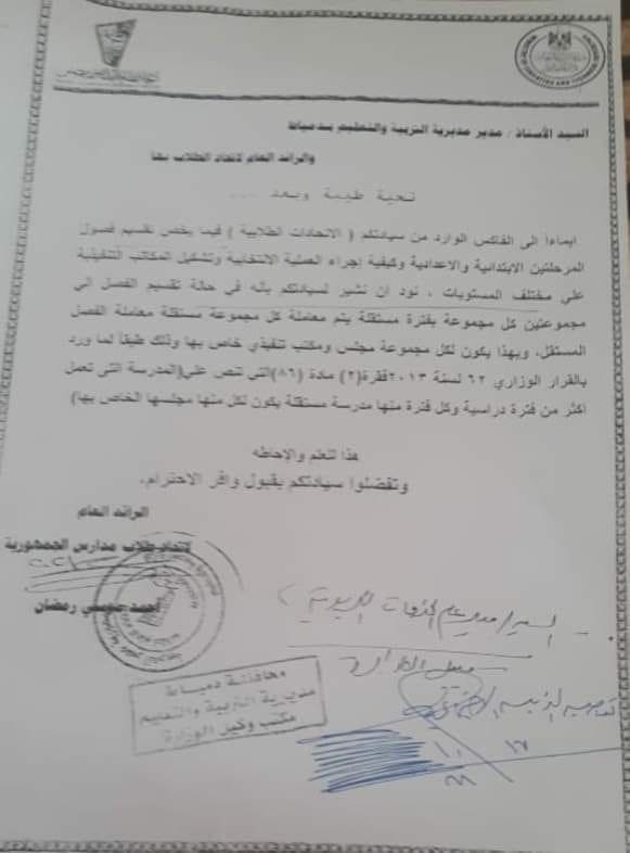 وجاء نص الخطاب كالتالي : "انه ايماءا إلى الفاكس الوارد من( الاتحادات الطلابية ) فيما يخص تقسيم فصول المرحلتين الابتدائية والاعدادية وكيفية اجراء العملية الانتخابية وتشكيل المكاتب التنفيذية علي مختلف المستويات، نود ان نشير انه في حالة تقسيم الفصل في مجموعتين كل مجموعة بفترة مستقلة معاملة الفصل المستقل، وبهذا يكون لكل مجموعة مجلس ومكاتب تنفيذية خاص بها وذلك طبقا لما ورد بالقرار الوزاري ٦٢ لسنة ٢٠١٣ فقرة ٢ مادة ٨٦ التي تنص المدرسة التي تعمل اكثر من فترة در اسية وكل فترة منها مدرسة مستقلة يكون لكل منها مجلسها الخاص بها .