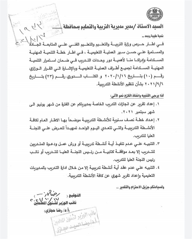وجهت مديرية التربية والتعليم والتعليم الفني، خطاباً هاماً لمديريات التربية والتعليم بشأن تنظيم الأنشطة التدريبية للمعلمين.