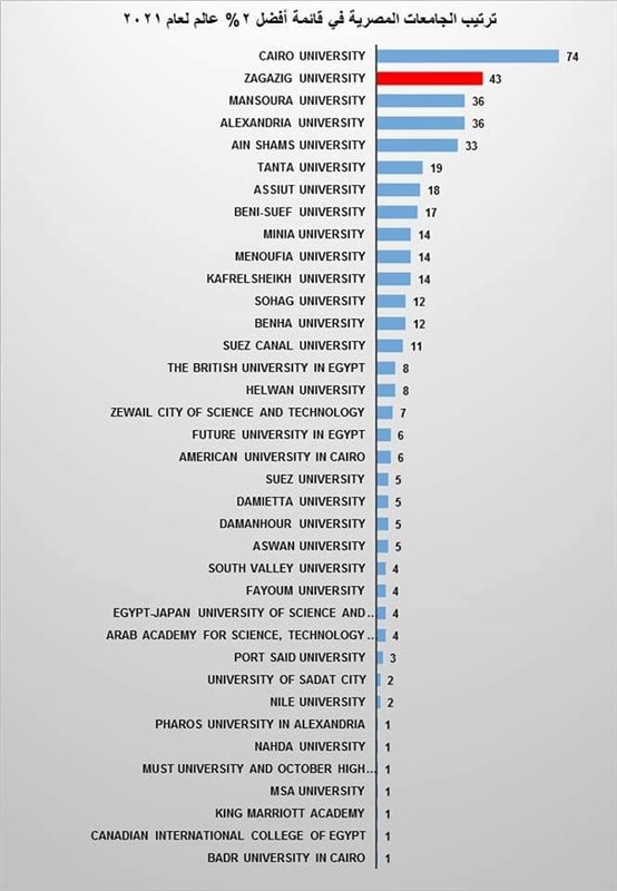 أعلن الدكتور عثمان شعلان رئيس جامعة الزقازيق، إدراج 43 عالمًا من أساتذة جامعة الزقازيق في قائمة أفضل 2% من العلماء حول العالم حيث تأتى فى المرتبة الثانية بعد جامعة القاهرة على مستوى الجامعات المصرية من حيث عدد الأساتذة المدرج أسمائهم، وفقا للدراسة الصادرة عن جامعة ستانفورد لأفضل ٢%عالم لعام 2021، وذلك طبقاً لمؤشرات الاقتباس المركبة لتحتل الجامعة مكانة عالية للعام الثاني علي التوالي بأكبر عدد علماء بالجامعة .