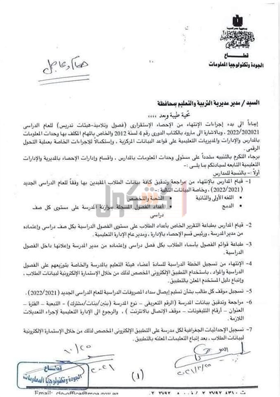 أصدرت وزارة التربية والتعليم والتعليم الفني، خطابا للمديريات التعليمية بجميع المحافظات على مستوى الجمهورية، بتسجيل موقف كل طالب من سداد المصروفات، وبدء إجراءات الانتهاء من الإحصاء الاستقراري «فصول وتلاميذ - هيئات تدريس» للعام الدراسي الجديد 2021-2022، لتنفيذ التعليمات الخاصة بالكتاب الدوري رقم 4 لسنة 2012، والخاص بالمهام المكلف بها وحدات المعلومات في المدارس والإدارات والمديريات التعليمية على قواعد البيانات المركزية، واستكمالا للإجراءات الخاصة بعملية التحول الرقمي.