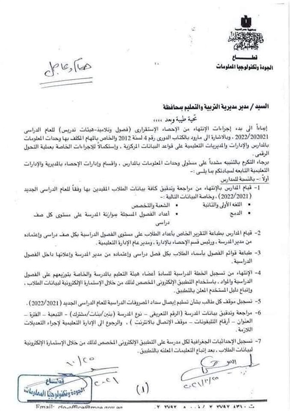 فشدد الخطاب، انه برجاء التكرم بالتنبيه على مسئولى وحدات المعلومات بالمدارس، واقسام وإدارات الإحصاء بالمديرية والإدارات التعليمية التابعة لكم بما يلي:
