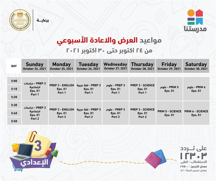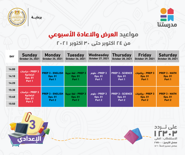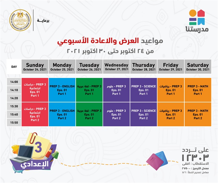 أعلنت قناة "مدرستنا" لطلاب الشهادة الإعدادية مواعيد عرض البرامج التعليمية للأسبوع الأول من العام الدراسي الحالي 2021-2022، مع مواعيد الإعادة الإعادة ، حيث يبدأ الجدول من يوم 24 أكتوبر حتى 30 أكتوبر 2021، ويمكن معرفة مواعيد العرض بمتابعة الصور المرفقة.