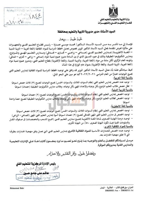 أصدرت وزارة التربية والتعليم والتعليم الفني، خطابا للمديريات التعليم بشأن تعديل الحصص الدراسية للمواد الثقافية ( اللغة العربية - التربية الدينية- اللغة الإنجليزية) بمدارس التعليم الفني (صناعي - زراعي - تجاري - فندقي) ومدارس التعليم المهني والمزدوج، ومدارس التكنولوجيا التطبيقية وذلك في ضوء التنسيق الذي تم بين مدیرو عموم تنمية المواد (صناعي - زراعي - تجاري - فندقي) ، والموجه العام المرکزي لكل مادة من مواد ( اللغة العربية، والتربية الدينية، واللغة الإنجليزية) بقطاع التعليم الفني، ومدیرو عموم تنمية مواد اللغة العربية، التربية الدينية، واللغة الإنجليزية ، بديوان عام الوزارة في هذا الشأن .