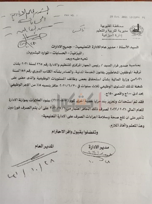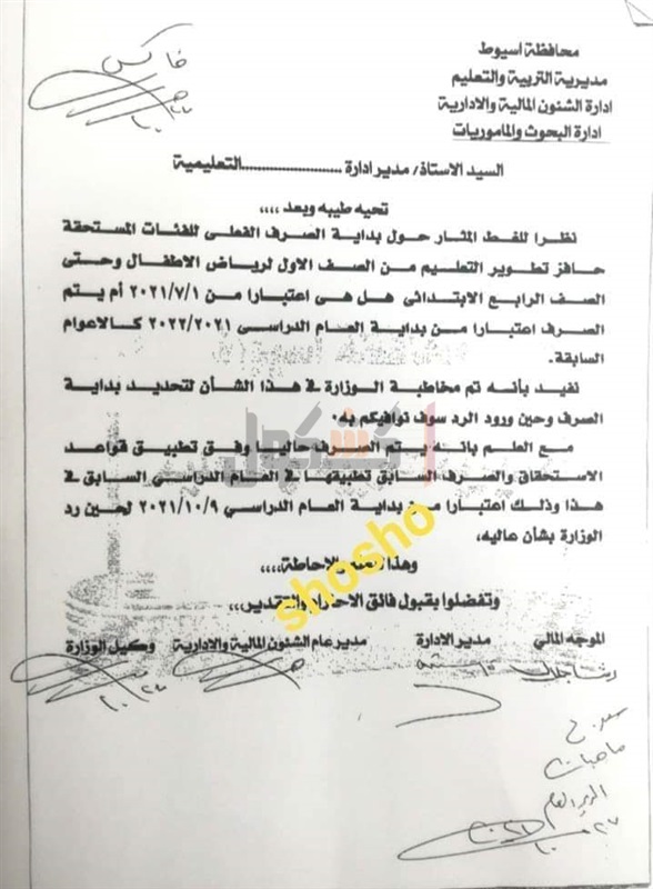 ولفتت إلى انه تم استحداث وتعزيز بند مزايا نقدية آخرى كود 21110507 ببنود العلاوات بموازنة الإدارة للعام المالي 2021/2022 لصرف ذلك الحافز اعتبارًا من 1 /7/2021 على أن يتم الصرف فورًا دون تأخير على أن تقع صحة وسلامة الصرف على الإدارة التعليمية.