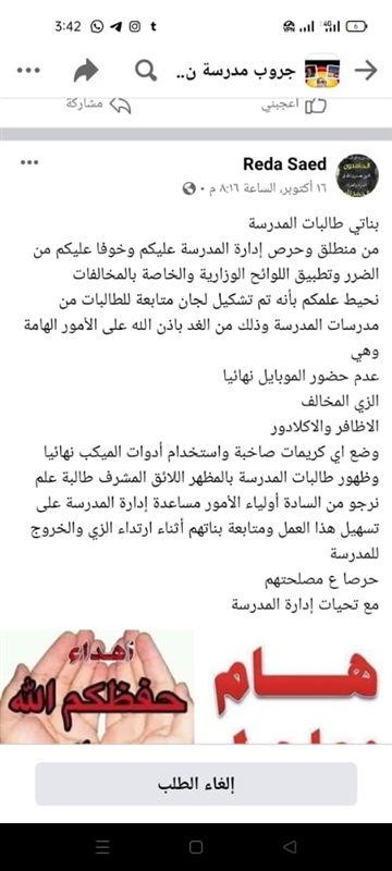أعلنت إدارة مدرسة ثانوية للطالبات بمدينة الخارجة في محافظة الوادي الجديد، اليوم الجمعة، عن صدور قرار مجلس إدارة المدرسة بمنع دخول الطالبات للمدرسة بالهواتف المحمولة والملابس الضيقة والمكياج.