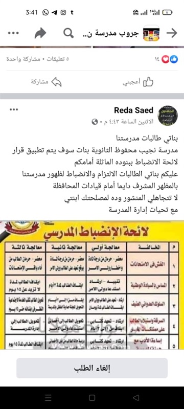 وأضاف حجي، أن القرار جرى تنفيذه بالفعل ولاقى قبول كبيرا جدا من أولياء الأمور عدا نسبة لا تتجاوز 3 % من أولياء الأمور وكان لهم وجهة نظر في القرار وهي منح فرصة لهم تتمثل في مهلة زمنية قصيرة لتغيير نوعية الملابس لدى بناتهن من الضيق إلى الفضفاض والواسع، بينما أحد أولياء الأمور وضح أنه موافق على خروج نجلته وهي بالمكياج ولكن جرى توضيح قرار المدرسة بأن ذلك حرية مطلقة له ولابنته داخل منزله أو في الشارع بينما هنا داخل المدرسة يجب الالتزام بقرار المدرسة لأنها منشأة تربوية عامة.