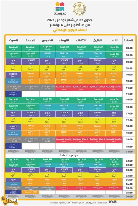 وأوضحت الوزارة لأولياء الأمور والطلاب من الصف الرابع الابتدائي حتى الصف الثالث الإعدادي، أنه يمكن التعرف علي مواعيد عرض البرامج التعليمية للمناهج المدرسية على قناة "مدرستنا" من ٣١ أكتوبر حتى ٦ نوفمبر بالإضافة إلى مواعيد الإعادة.