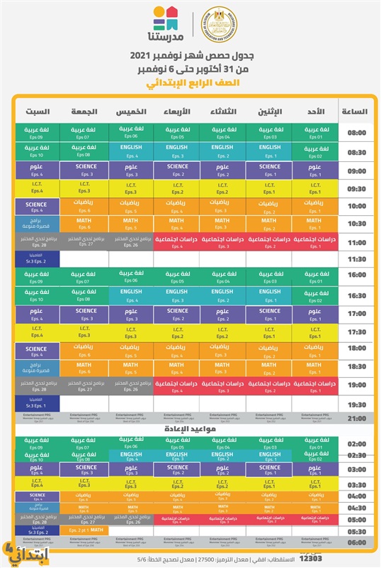 جدول مواعيد قناة مدرستنا الصف الرابع الابتدائي 2021-2022