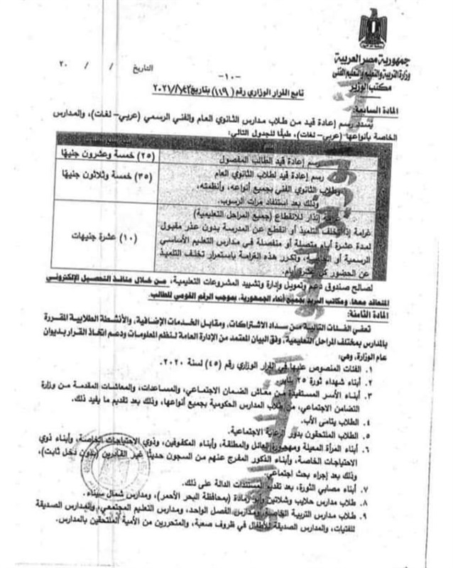 حددت وزارة التربية والتعليم والتعليم الفني، وفقا للقرار الصادر برقم ١١٩ بتاريخ ٢٣ اغسطس لسنة ٢٠٢١م ، رسوم إعادة القيد لطلاب المدارس الثانوى العام والفني الرسمي " عربي و لغات" والمدارس الخاصة بأنواعها " عربى ولغات"، حيث تتمثل فيما يلي :