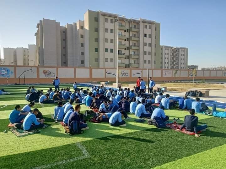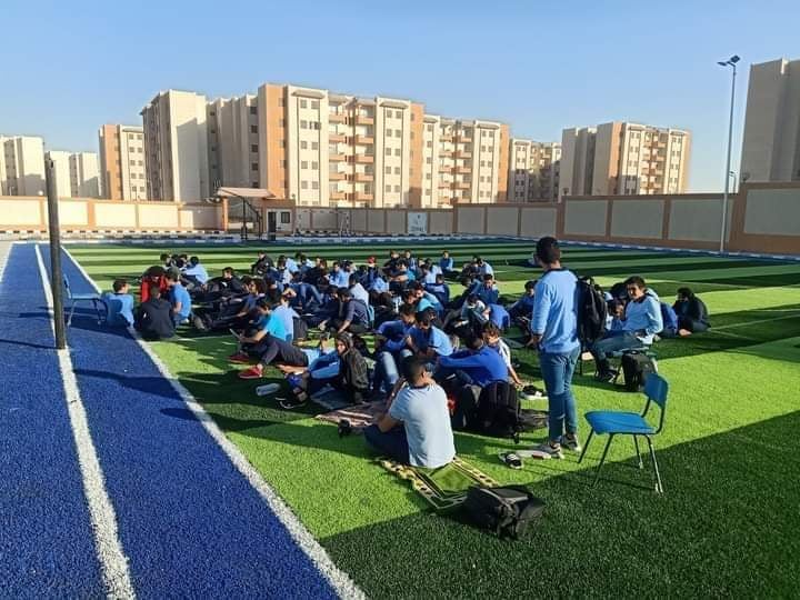 وافترش طلاب المدرسة الارض بفناء المدرسة اعتراضا علي المشاكل التي تواجه المدرسة وللمطالبة باصلاح حالها.
